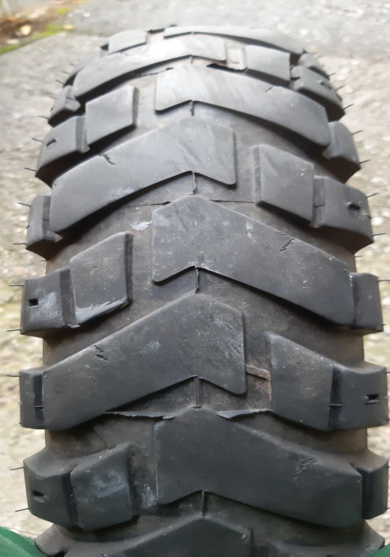 Die ersten Risse hatte der schon in England auf dem Hinweg. In Schottland waren die Stollen eingerissen aber noch da. Auf Rücksicht auf die Urlaubskasse sind wir vorsichtig weiter gefahren. Am Rückweg nach England fehlten schon einzelne Stollen, nach der Fähre nach Frankreich sah der Reifen überhaupt nicht mehr gut aus. Ich wette, wir wären auch noch damit nach Hause gekommen, aber ich hab mir im Emsland einen Nagel reingefahren. Der Reifen war damals mit Schlauch aufgezogen und den hats zerrissen beim Ausrollen mit plattem Reifen. Sonst hätt ich das Ding auch mit Reifenpilot noch nach Hause gefahren. So hab ich aber den teuersten ME55 meines Lebens kaufen müssen.(und zu Hause gegen einen fahrbaren BT45 gewechselt)