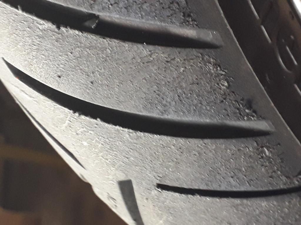 Die Reifen sind gut (und auch noch nicht alt), haben aber in der Endurance keine Zeit zum abhühlen bekommen, Streckenbelag war auch entsprechend heiß, die Reifen wurden bei der Endurance definitiv überhitzt. Gut zu erkennen an der Kleinen. Bis zum Noteinsatz in der Endurance sah der Vorderreifen noch sehr gut aus, danach zeigte der Reifen auf der rechten Seite deutliche Abnutzungsspuren.Bei der Großen hat sich zusätzlich zu den Schmierspuren auch noch ein deutlicher Sägezahn gebildet :gruebel: