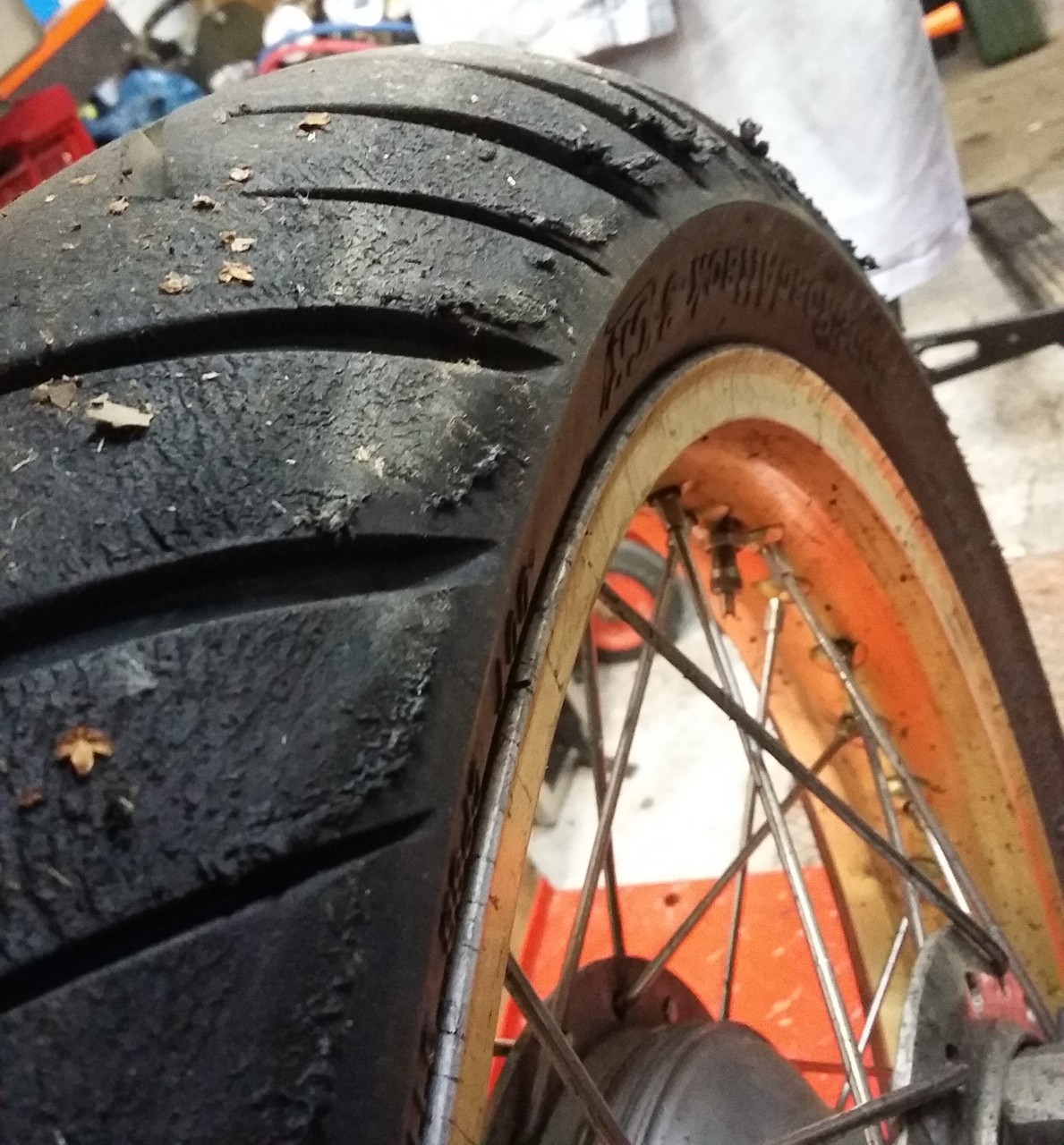 Die Reifen sind gut (und auch noch nicht alt), haben aber in der Endurance keine Zeit zum abhühlen bekommen, Streckenbelag war auch entsprechend heiß, die Reifen wurden bei der Endurance definitiv überhitzt. Gut zu erkennen an der Kleinen. Bis zum Noteinsatz in der Endurance sah der Vorderreifen noch sehr gut aus, danach zeigte der Reifen auf der rechten Seite deutliche Abnutzungsspuren.Bei der Großen hat sich zusätzlich zu den Schmierspuren auch noch ein deutlicher Sägezahn gebildet