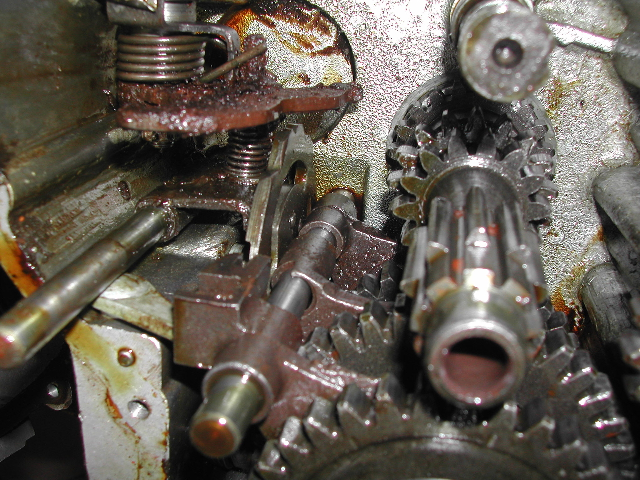 Die Welle wird von einer Madenschraube fixiert ähnlich wie die Welle für den Retourgang. Nur das die Schraube scheints zu lange war, und man sie einfach plan gefräst hat, bis der Schlitz für den Schraubenzieher weg war