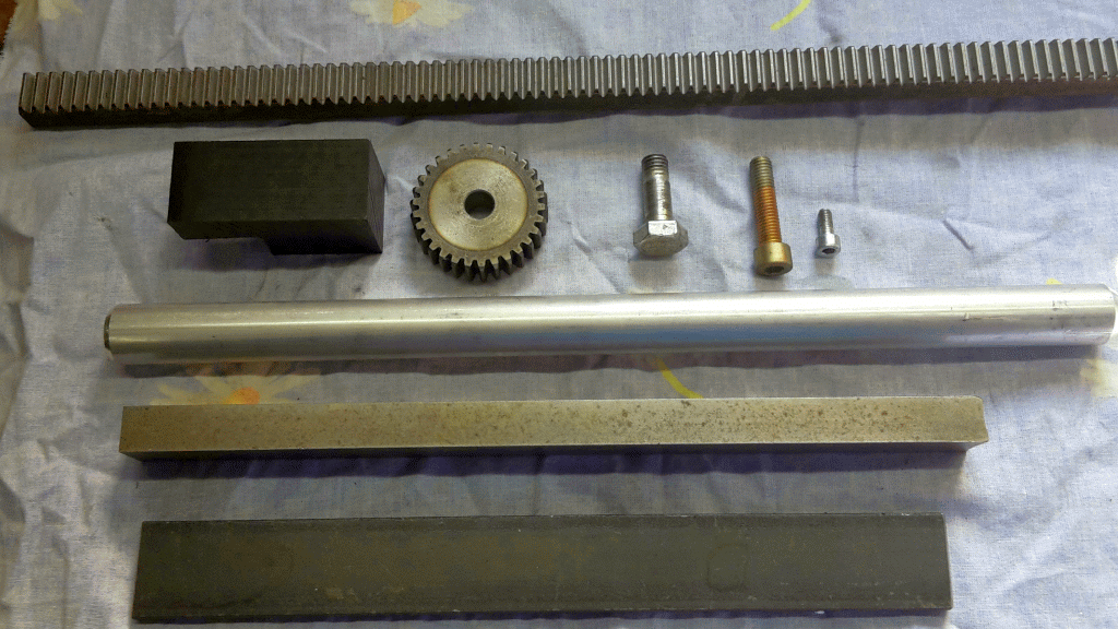 Für den unwahrscheinlichen Fall dass das Teil in der Praxis doch nicht taugen sollte war Kaufen keine Option, also kam nur ein Selbstbau in Frage. Stahl- und Alumaterial, ein paar Kleinteile waren schnell gefunden, die Zahnstange und das Zahnrad habe ich zugekauft.