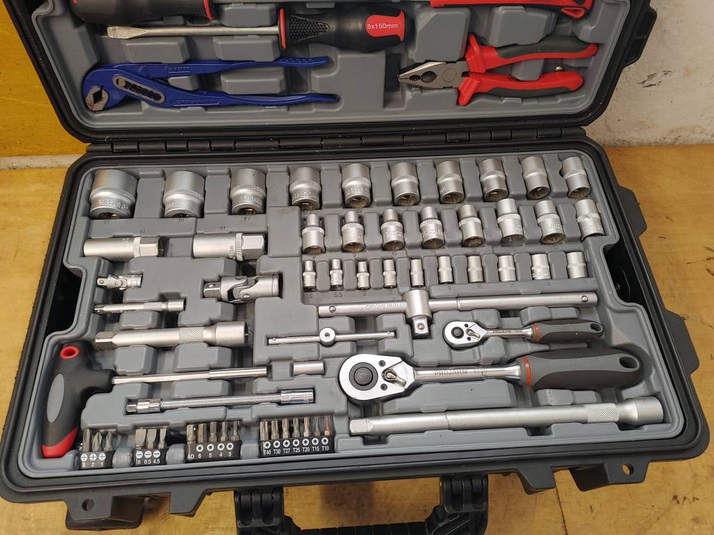 Ein Werkzeugrollkoffer, den ich mal bei meinem Lieblingswerkzeughandel angeboten bekam und ganz dringend mitnehmen mußte. Allerdings habe ich ihn nur selten benutzt. Alle Werkzeuge daher in sehr gutem Zustand oder sogar noch unbenutzt. Die Werkzeugqualität würde ich bei Carolus (Gedore Red) einordnen. Gute Mittelklasse.