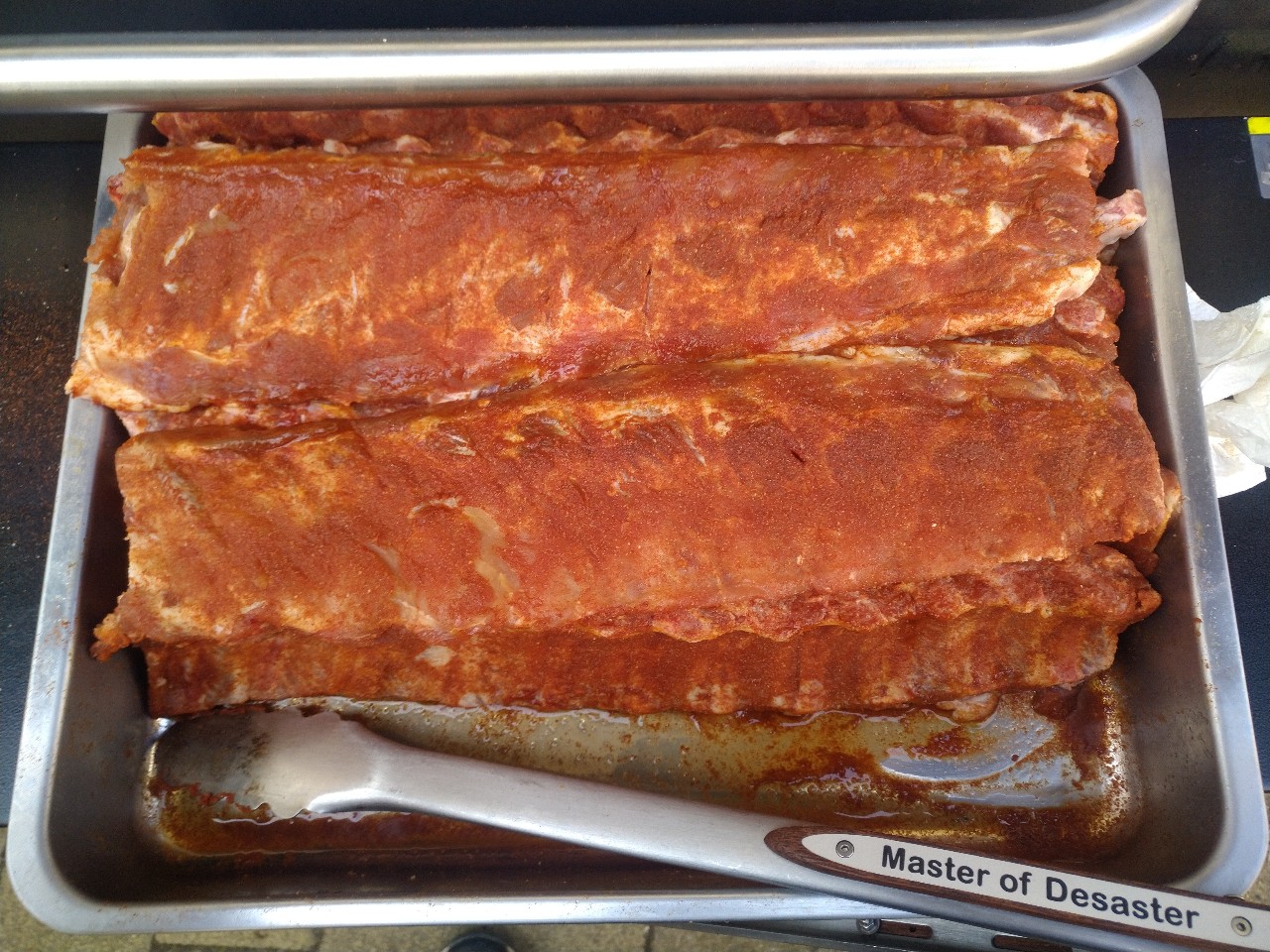 Heute morgen die Fleischseite etwas nachgewürzt, damit der Zucker auch ein schönes Karamell entwickeln kann.