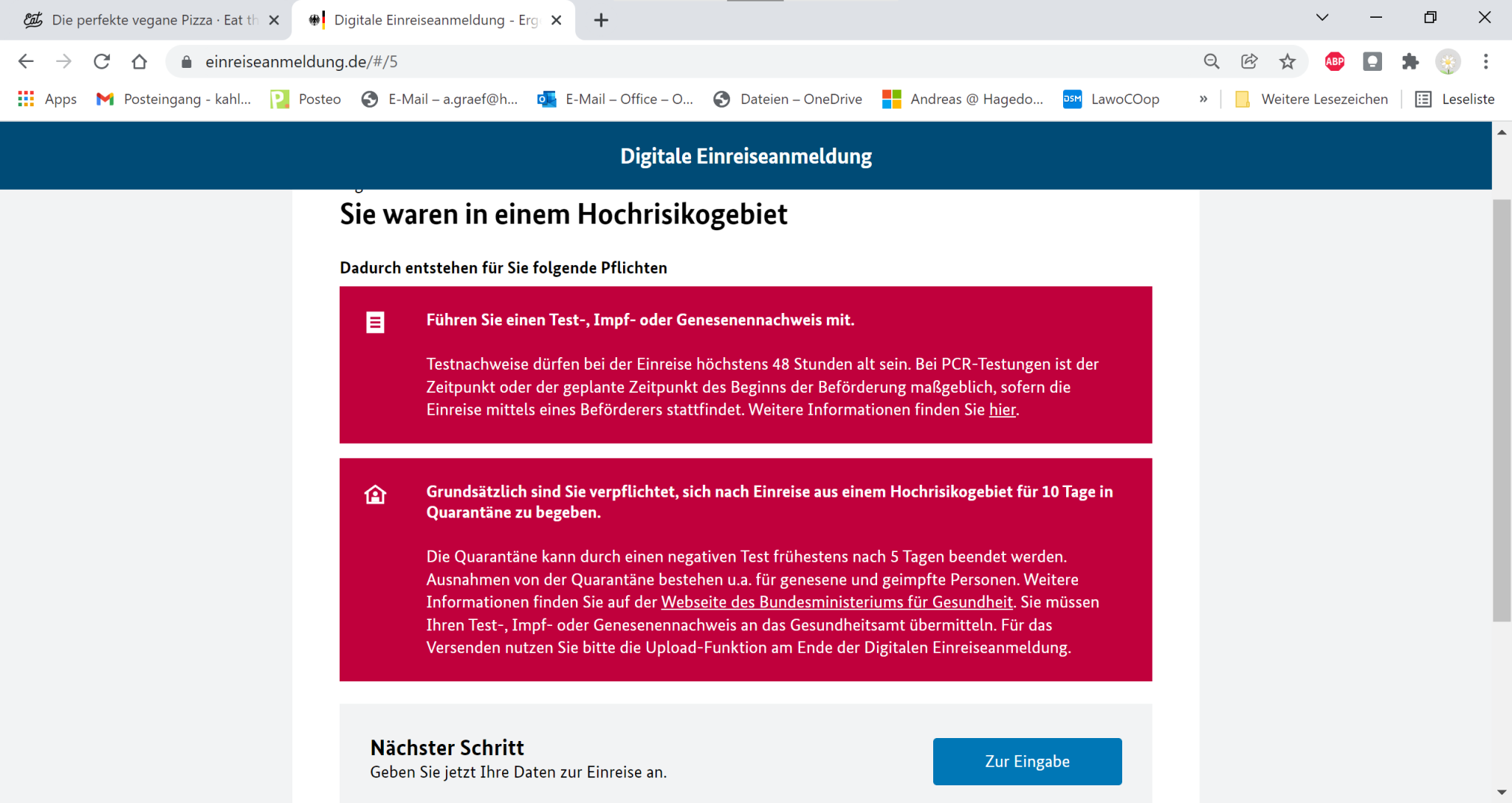 sich dort häuslich absondern (Quarantäne). Nach einem Aufenthalt in einem Hochrisikogebiete müssen sich Einreisende sich für 10, nach einem Aufenthalt in einem Virusvariantengebiet für 14 Tage häuslich absondern.