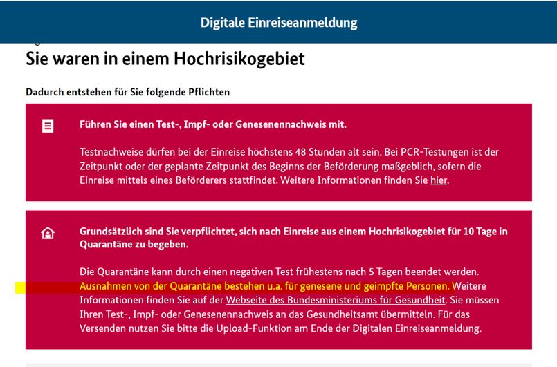 "Ausnahmen von der Quarantäne bestehen u.a. für genesene und geimpfte Personen"