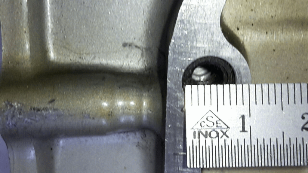 nach reinigung und mehlbestäubung konnten wir die stelle identifizieren, wo es raustropft. tatsächlich dort, wo das helicoil eingesetzt wurde.