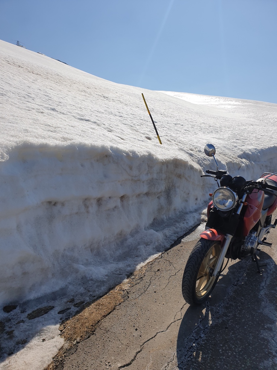 Oben musste man ein wenig aufpassen, denn die Schmelzwasserrinnsale waren im Schatten halt gefroren. Und es hat dort nordseitig noch ordentlich Schnee, so dass auch der Lift noch fährt. Und es ist schon noch kräftig Salz auf der Straße, was jetzt auch nicht verwundert, denn der Jaufen ist einer der wenigen hohen Pässe, die ganzjährig offen gehalten werden.
