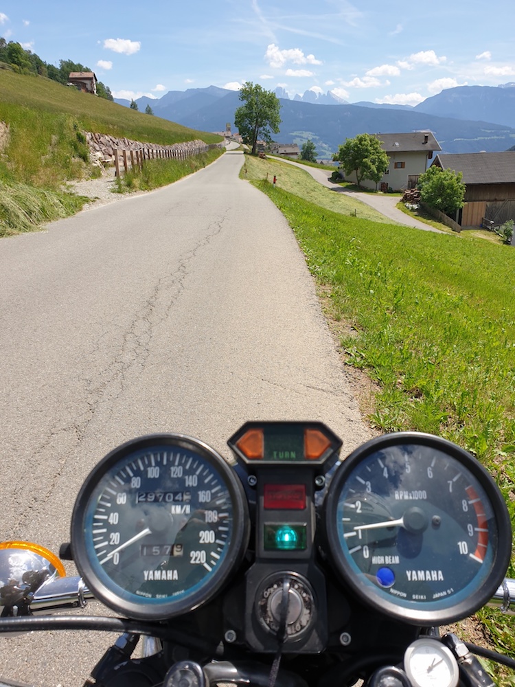 Also über den Brenner, allein, in morgendlicher Frische. Aber in gemessenem Tempo, denn schon waren fünf Spots besetzt mit Radarpistolisten, wohlgemerkt nur bis Matrei. Dann weiter nach Süden, den Weg kennt ihr alle aus mehrfahcen Schilderungen. Bis kurz vor Klausen, dort scharf rechts hinauf nach Velthurns (richtig, da war doch das Renaiisanceschloss!), aber dieses schmählich beiseite lassend und nach Latzfons weiter. Auch da waren wir schon, als wir nach Schloß Gerstein und weiter durch das Tinnebachtal nach Klausen wollten . Heute ging es am Ortsende von Latzfons rechts aufwärts erstmal Richtung Latzfonser Kreuz. Das erreicht man zwar nicht per Motorrad, aber immerhin kommt man bis zum Ende der für Weltmeisterschaften zugelassenen Naturrodelbahn dort und die Ausblicke in die Dolomiten, die sich immer wieder bieten, sind wahrlich spektakulär.