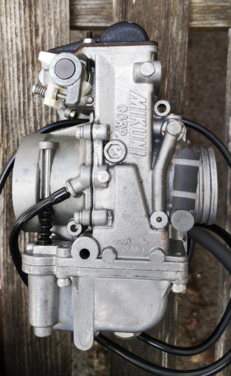 Das große war der Vorbesitzer, der aus tiefster Überzeugung an so ziemlich jeder Schraube rumgedreht hat. Das kleinere, dass der Vergaser an einer TE410 war. Das kleinere ist schon gelöst; der Adapter hinten ließ sich recht leicht auf der Herdplatte erwärmen und dann vom Vergaser trennen. Das größere Problem ist, dass der Vorbesitzer mit Freuden auch die Beschleunigerpumpe verstellt hat. Und da hätte ich jetzt ein paar Frage plus die Bitte nach einem Foto, wo man die Werkseinstellung sieht.