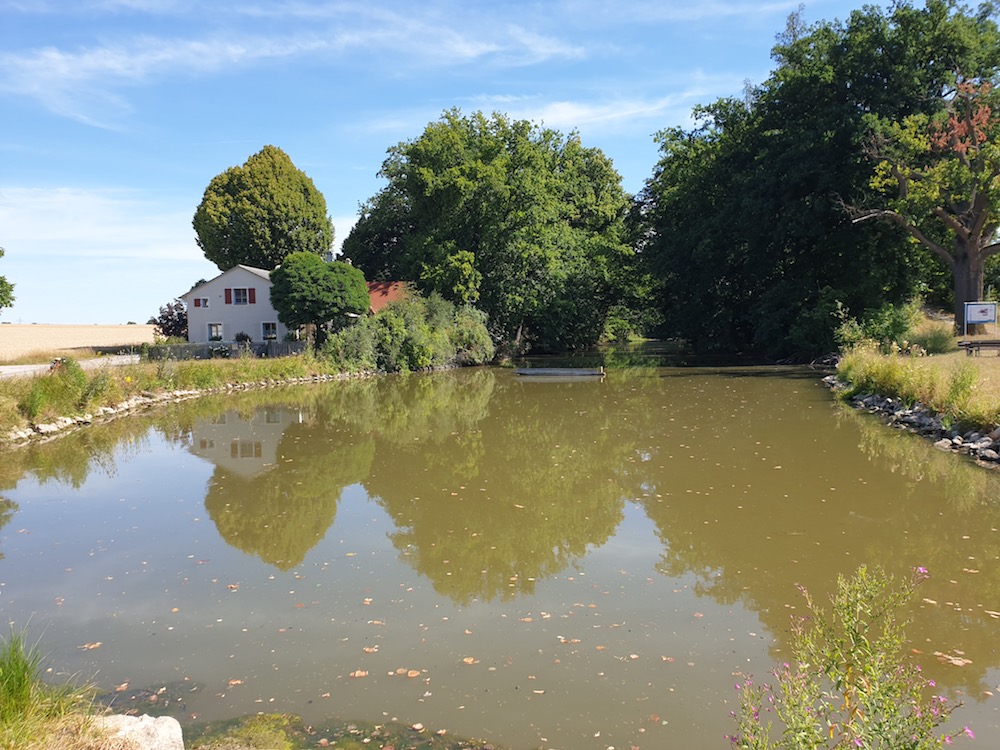 Nach der größten Mittagshitze ging es dann weiter nordwärts durch hügeliges Gelände, Wald- und Seenreich. Und keine Autos - a Traum! Und auch die Übernachtung war bereits geregelt: Auch hier war die bereits genannte Motorradfahrerin hilfreich gewesen, indem sie die Buchung in einem wirklich erstaunlichen resort namens "Kormoran" getätigt hatte. Das liegt bei Sulecin und man erreicht diese Idylle mit Badesee durch eines der ehemals wohl wichtigen, aber nun eher zerfallenden Industriegebiete mit ihrem morbiden Charme, die aber dann das Ziel in deutlich heller werdendem Licht erstrahlen lassen.