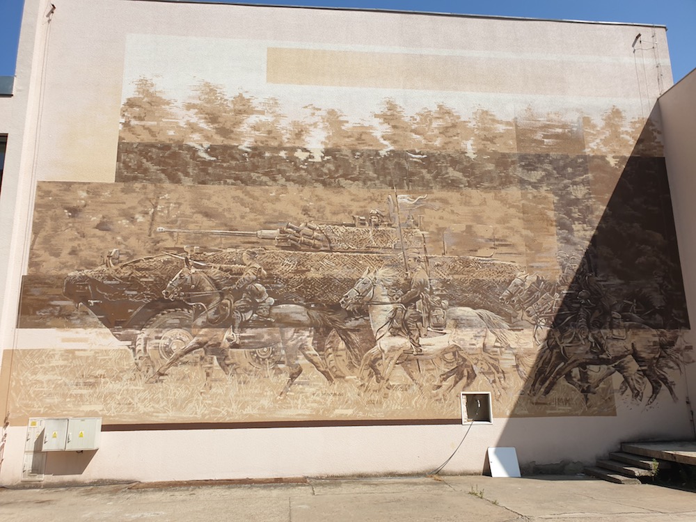 Am Folgetag wollte ich mir nur wenige Kilometer geben und bin beim umhergondeln durch die weiten Wälder auf eine der wohl für Polen typischen Waldkasernen getroffen (Wedrzyn). Nach meiner Einschätzung mindestens eine halbe Panzer-Brigade, also doch recht groß. Und eine Garnisonskirche und ein (nicht mehr betriebenes) Offizierscasino mit einer riesigen Wandbemalung, die zeigt, wo sich die Traditionslinien der polnischen Armee finden lassen. Letztlich ist es die Kavallerie, die noch im 2. Weltkrieg mit ebenso tapferen wie sinnlosen Attacken gegen mechanisiserte Gegner antrat und deren "Urväter" die Flügelreiter waren, mit denen der polnische König Johann Sobieski die Türken vor Wien vertrieb. Ich bin, weil mich solche Traditionslinien und die Meta-Ebenen auch der Armeen interessieren, noch in die Garnisonskirche. Schon erstaunlich, was die katholische Kirche bis und mit heute für Polen und seine Armee spielt!