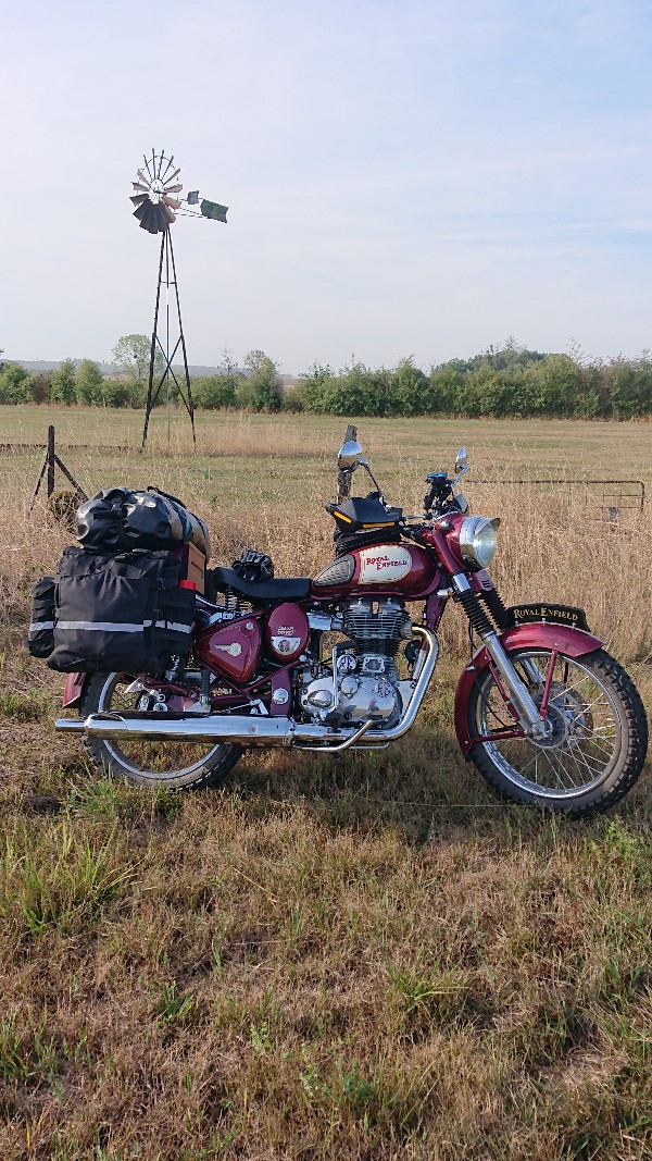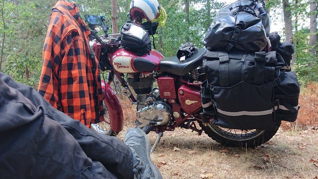 Die kleine Enfield macht das sehr gut. Der Traktormotor lässt keine Hektik aufkommen und schiebt gutmütig vor sich hin. Sie ist auch noch mit Gepäck leicht und fluffig zu handeln, nur die Federwege limitierten das Vergnügen. Oder sie vergrößern es, je nachdem.