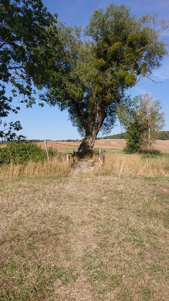 Bei dem kleinen Ort Aboncourt führte nochmal ein kleiner Abschnitt über einen Feldweg. Der führte auf eine gemäht Wiese und von dort auf einen weiteren Feldweg leicht bergab an einer Weide vorbei. Total harmlos. Am Übergang zwischen Wiese und Feldweg waren große Schlaglöcher, die mit Bruchsteinen gefüllt waren. Wie schon hunderte zuvor. Die große Stelle passierte ich ohne Mühen, war sogar wieder mal überrascht wie stabil die Enfield fährt.