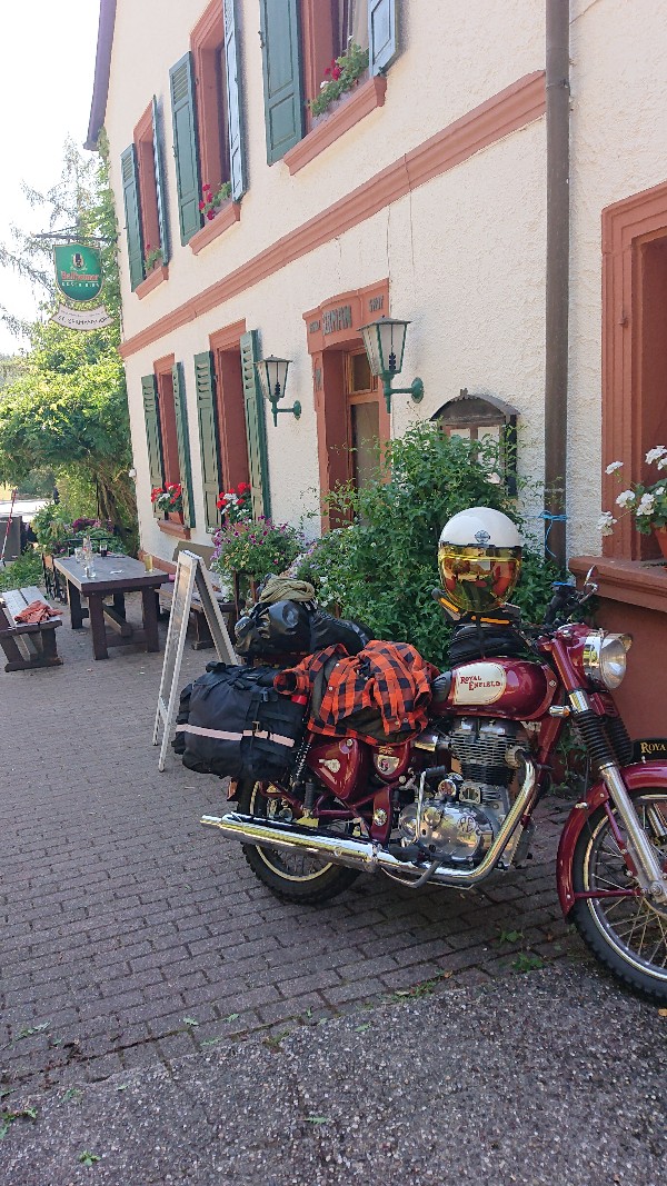 Die Enfield brummelt wunderbar entspannend vor sich hin und bringt mich zügig über Land ins Elsass.