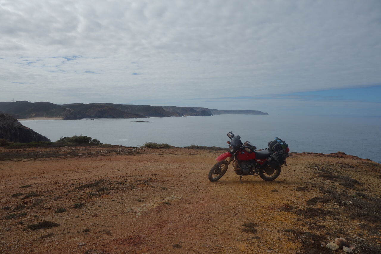 Richtung Südosten: blauer Himmel, also nach Sines an der Küste. Kurz vorher schiebt sich eine Wasserwand in mein Sichtfeld. OK, Wettergott, du hast gewonnen! Ich zieh die Regenkombi an, immerhin bin ich halbwegs trocken von den Regenpausen.