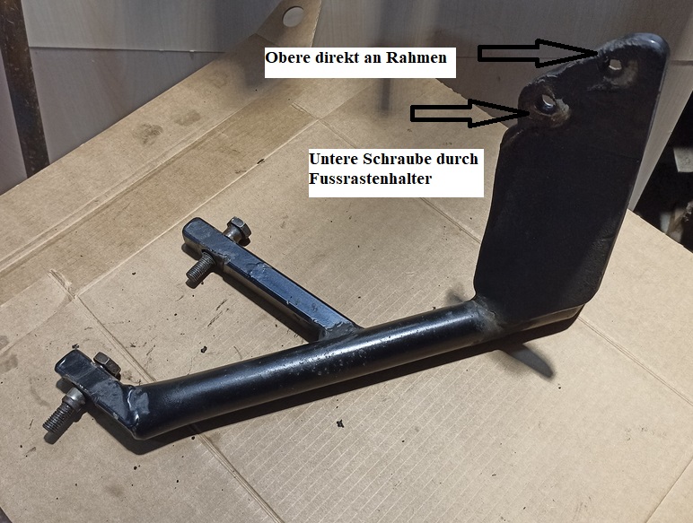 Das Blech welches auf das Rundrohr geschweisst ist wird hinter den Fuussrastenhalter geschoben und am Rahmen verschraubt. Eine Schraube durch den Fussrastenhalter gesteckt.