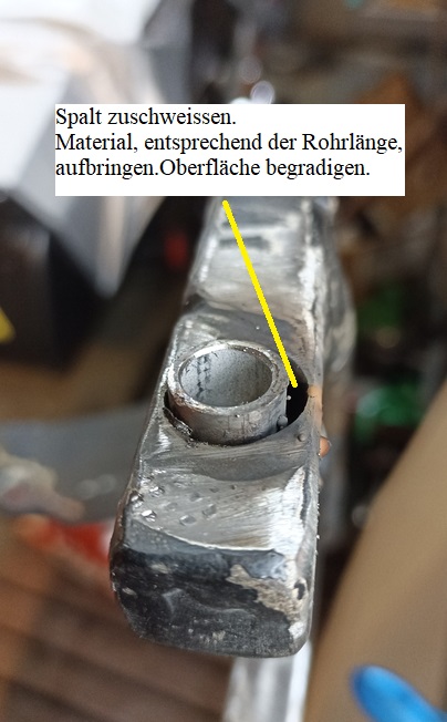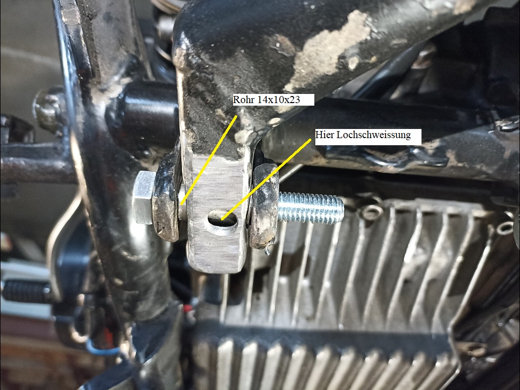 Heute hatte ich etwas Zeit um am Halter zu arbeiten. Die Laschen am Rahmen waren nicht ausgeschlagen. Je eine Lasche hat eine 14er Bohrung und diese habe ich mit einer Hülse auf 10mm reduziert. Dann habe ich 2 Stück Rohr, auf Laschendistanz, abgelängt, in das Vierkant gesteckt und nach der Montage mit einem Schweisspunkt (Lochschweissung) fixiert.