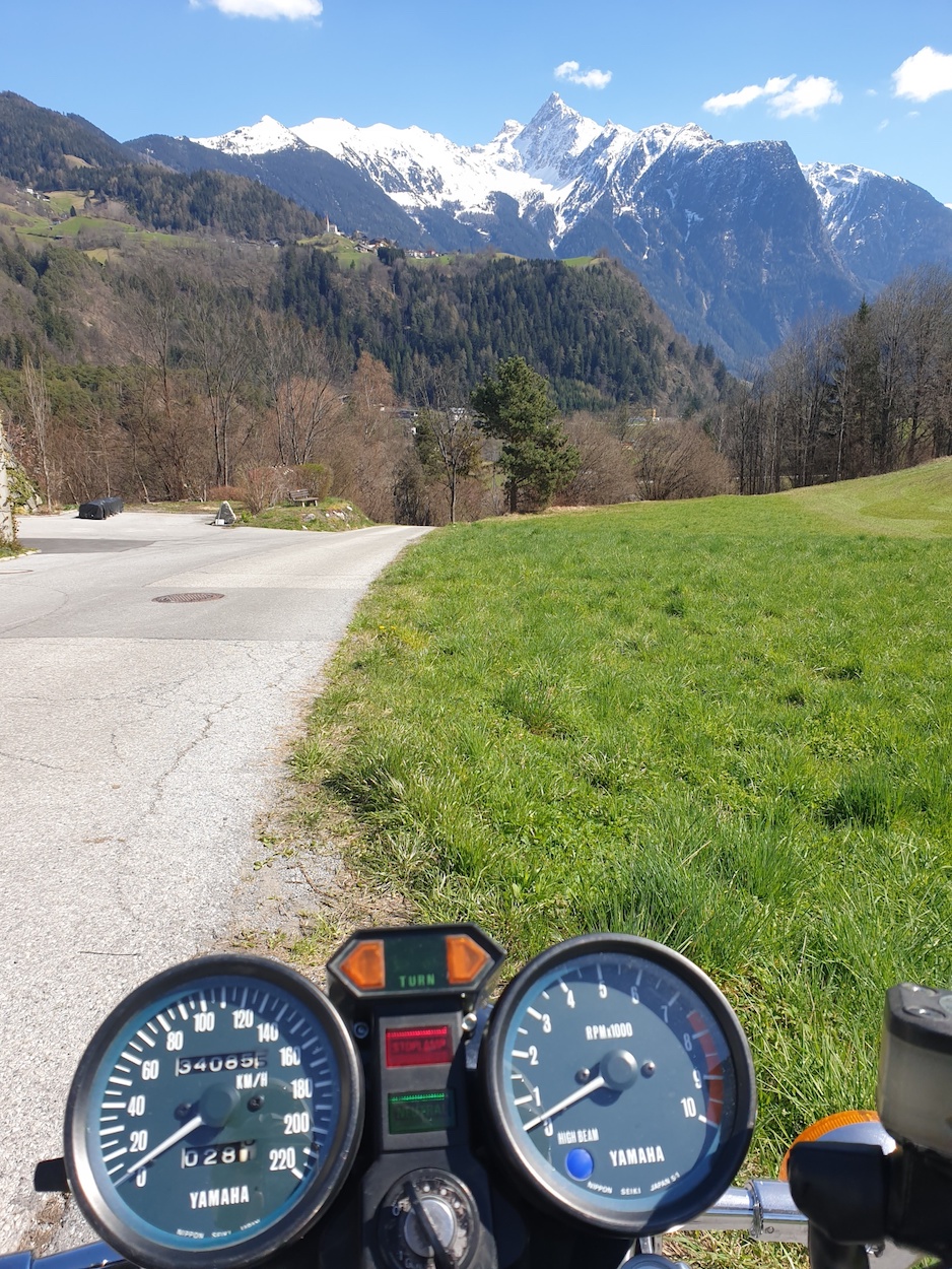 Und vor lauter Begeisterung hätte ich mich an der Einmündung zur Ötztal-Bundesstraße fast auf die Nase gelegt, weil ich beim Abbiegen zu viel Gas gegeben habe und das Hinterrad wegrutschen wollte.