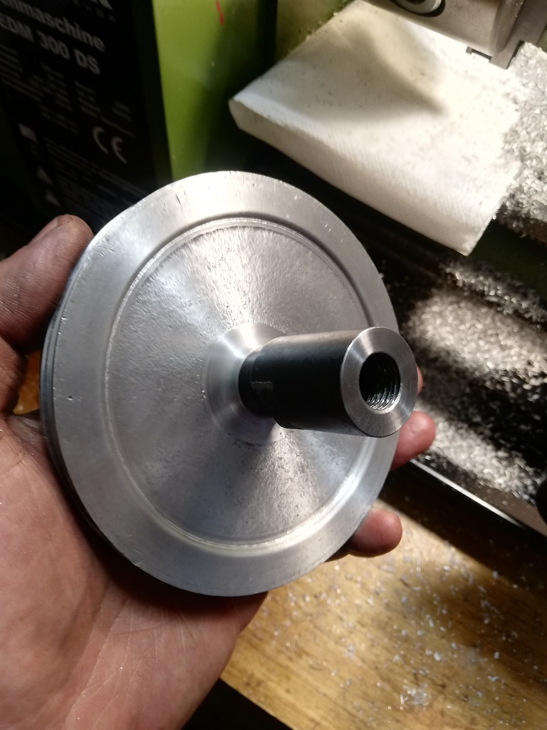 Das Nacharbeiten auf der Drehbank war ein wenig kniffelig, da man mit diversen Flächen und einem Konus jonglieren und außerdem das Einspannen wirklich exakt sein muss, aber letztlich habe ich den Höhenschlag tatsächlich eliminieren können. Ein leichter Seitenschlag ist noch da, aber der liegt darin begründet, dass die Riemenscheibe an sich liederlich ist bzw. der Konus anscheinend nicht 100% da sitzt, wo er sitzen sollte. Irgendwie so. Da kann ich nix machen mit meinen Mitteln. War eh schon lustig, die Riemenscheibe auf meine kleine Drehbank zu kriegen...