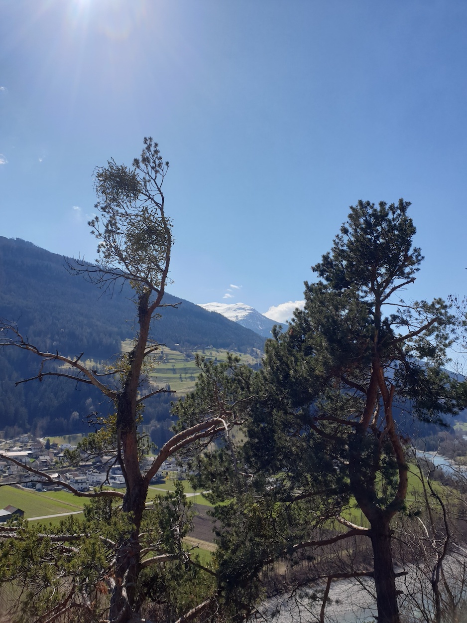 - Pause über dem Inntal bei Imst: Blick durch die Schwarzkiefern auf den Venetberg
