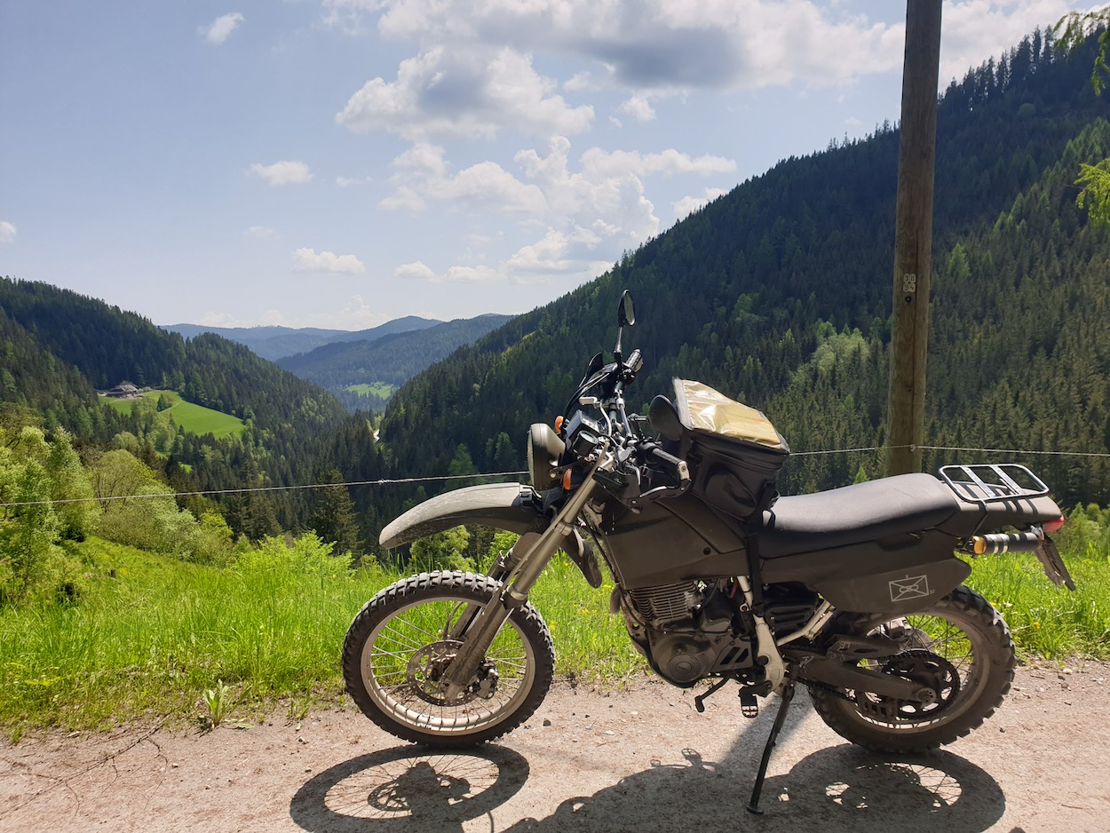 Nach den zwei Anwendungen des Nachmittags (Fango mit anschließender  Massage) rief nicht nur das strahlende Wetter nach einem Zweiradausflug. Um 1615 Uhr gelang es mir, mich dem energischen Zugriff der Masseuse zu entziehen ( de facto war einfach die Zeit um ;-)), warf mich in die Kombi, übersah einmal mehr den Dreck an der TTE und war dahin. Ziel war zunächst, das Bärental über das Rosental zu erreichen. Dort wies meine Karte noch einen kleinen Verbindungsweg Richtung Unterloibl aus, die mich sehr anmachte.