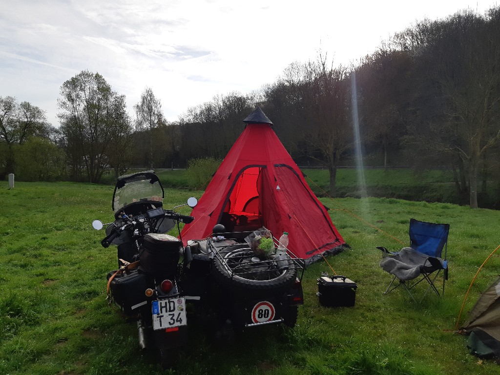 Das neue Tipi, Feldbett mit kleiner Luma als Topper, leichte Penn Tüte mit Kuscheldecke, Kleiner Falttisch und -Stuhl in den Beiwagen