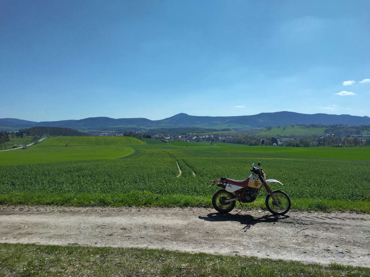 Wilsdruff, Tharandt, dort sah ich eine Gruppe MZ vor mir (auch ein /2-Gespann war dabei), die sind aber irgendwo abgebogen, vermutlich ein Oldtimertreffen. War ich aber irgendwie schon vorbei, bis ich das realisierte. Egal, ich wollte eh fahren, nicht quatschen, also weiter nach Rabenau, Glashütte, Altenberge, dort auf die B170 Richtung Süden/Tschechien. Dort geht es auf langgezogenen Kurven das Erzgebirge wieder runter. Leider nicht sonderlich schnell, ein Auto war vor mir und ich wollte wegen der vermuteten Polizeipräsenz (die sich erst später zeigen würde) nicht über die doppelt durchgestrichenen Linien fahren. Unten in Tschechien wieder tanken (nur der Form halber, der Tank war noch halbvoll), ein paar Snacks gekauft und über Mikulov und Moldava wieder zurück nach Deutschland.