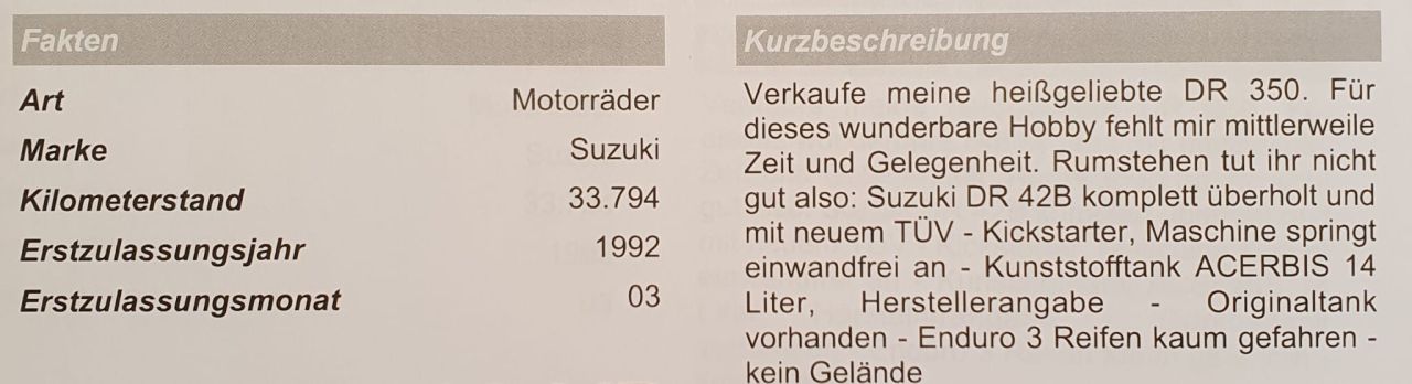 Eine Freundin will ihre DR350 verkaufen, sie hat keine Zeit mehr dafür, hat bisher aber keine vernünftige Resonanz gefunden (was ist letzte Preis? usw.)