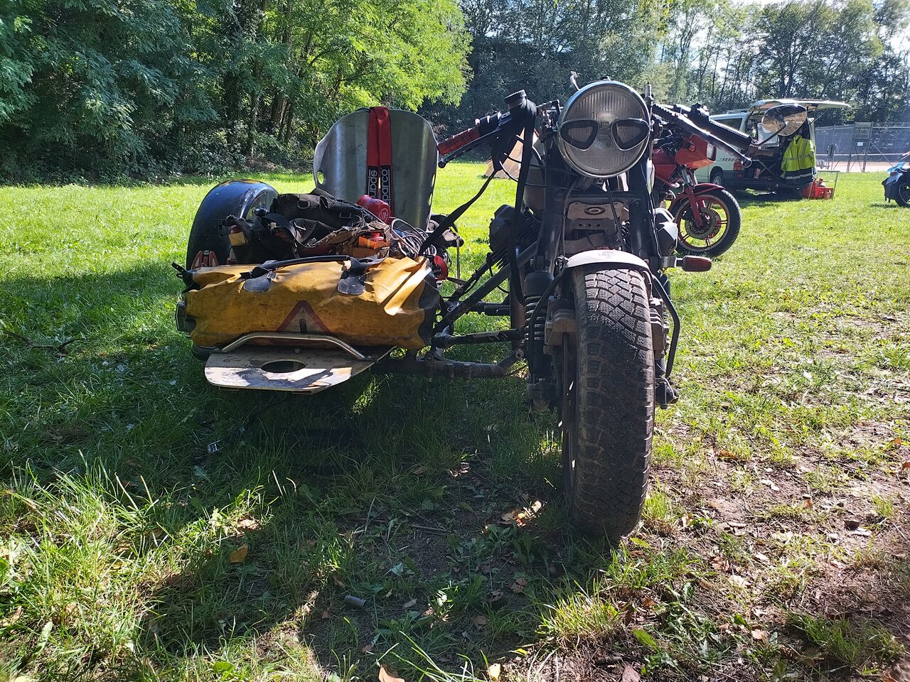 Und so fahre ich den Kowalski. Den Bremshebel kann ich quasi garnicht erreichen, aber immerhin funktioniert hier die vordere Bremse sehr gut, ansonsten kann sich trotz des extrem harten Sitzes der Arsch entspannen, denn eigentlich sitze ich nicht, sondern hocke quasi auf dem Gespann. Das führt nach einer Weile zu Krämpfen in den Beinen, aber da ich eine kurvige Strecke fahre, nutze ich die Gelegenheit, auf dem Gespann ordentlich zu turnen. Durch die Sitzhaltung geht das fast von selbst, und so kommt ab und zu ein Schluck frisches Blut in die Beine.