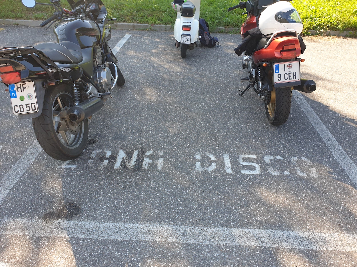 ) brav hinterher. Nach einer eleganten Kehre auf einem verwaisten Hotelparkplatz schaffen wir es dann zu der kleinen Stichstraße zum Monte Penegal. Eigentlich wollte ich dendort am Kiosk verabreichten Café genießen - aber der ist geschlossen wegen irgendwelcher Machinationen im Raum-Zeit-Kontinuum. Hmpf!
