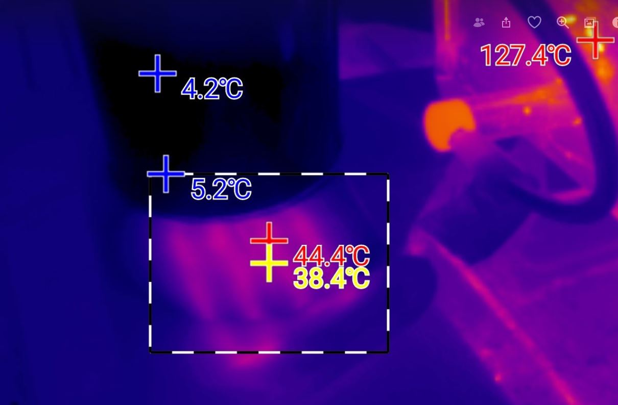 90 Minuten, knapp 200g Weber-Gasmischung, 2000 mAh Akkuverbrauch (7 Wh). Der Motor alleine braucht fast nichts, aber ich hatte zusätzlich eine kleine USB-Heizmatte laufen, auf die ich die Gaskartusche gestellt hatte, testweise ohne Isolierhülle. Die hielt die Kartusche tatsächlich frostfrei (Lufttemperatur windstille 10 °C). Thermoaufnahme der Kartusche mit darunterliegender Heizmatte: