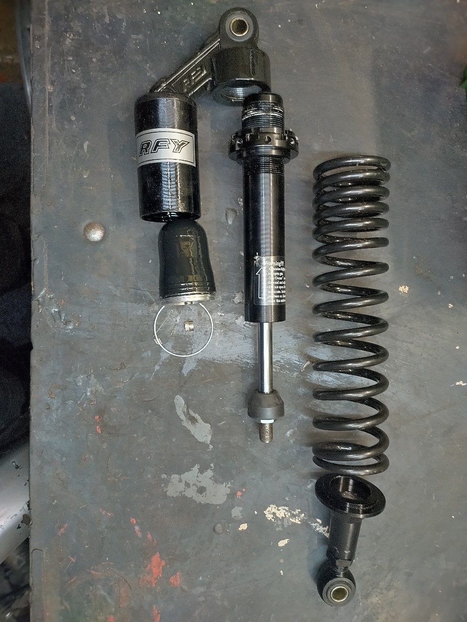 Stoßdämpfer sind soweit vorbereitet und je einer vorne und hinten mit den YSS-Federn zusammengebaut.