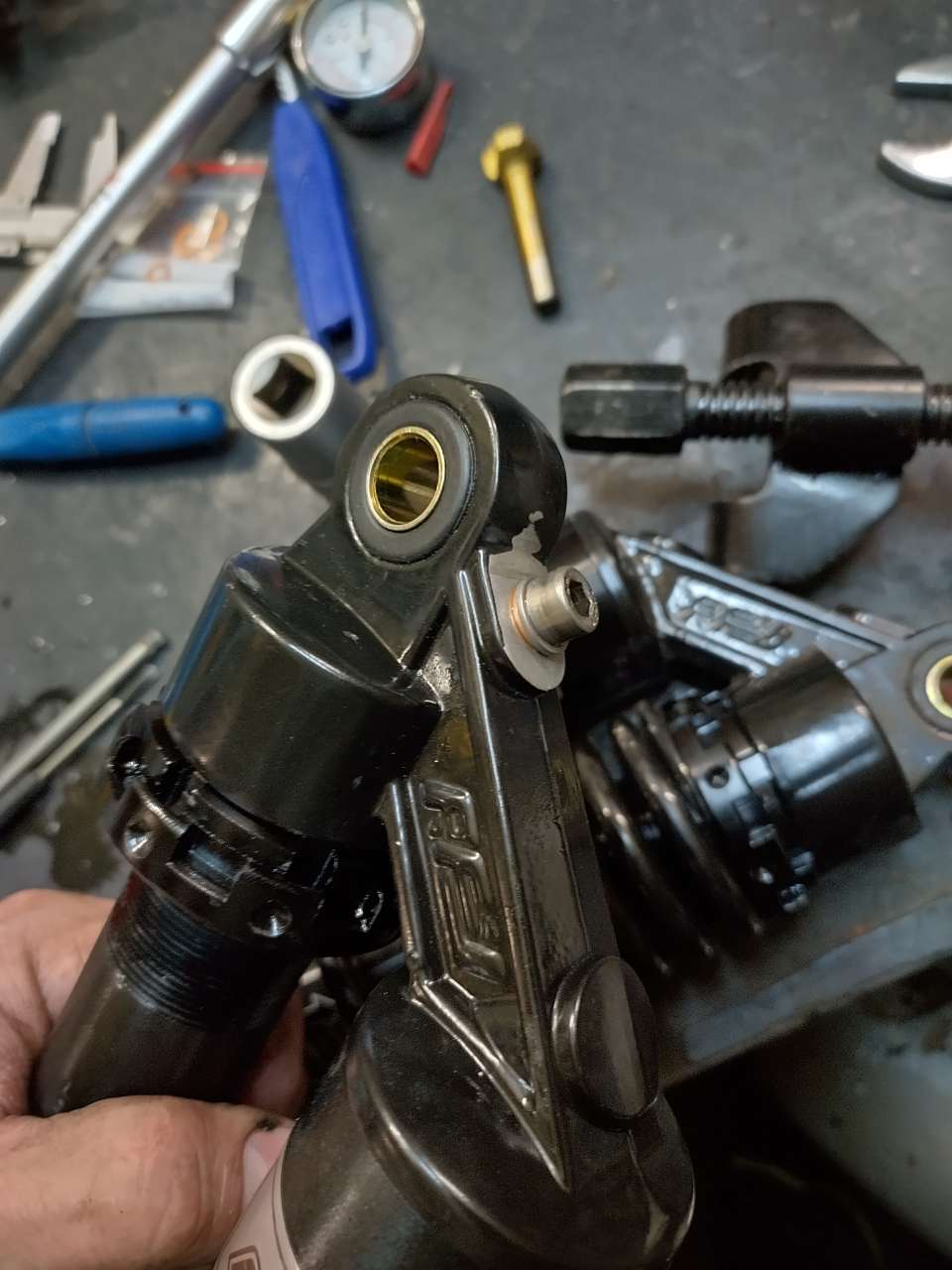 Die YSS haben eine Einfüllöffnung, ich ging davon aus, dass die für das Gas ist (es sind Gasdruckdämpfer), dem scheint aber nicht so. Also mal ein wenig Öl eingefüllt und siehe da: er dämpft wieder. Allerdings verstehe ich nicht, wie die das mit dem Gas gemacht haben, dafür sollte es ja eigentlich einen zweiten Kolben samt Kammer geben. So ist ja jetzt nur Luft mit dem Öl zusammen in der Kammer.