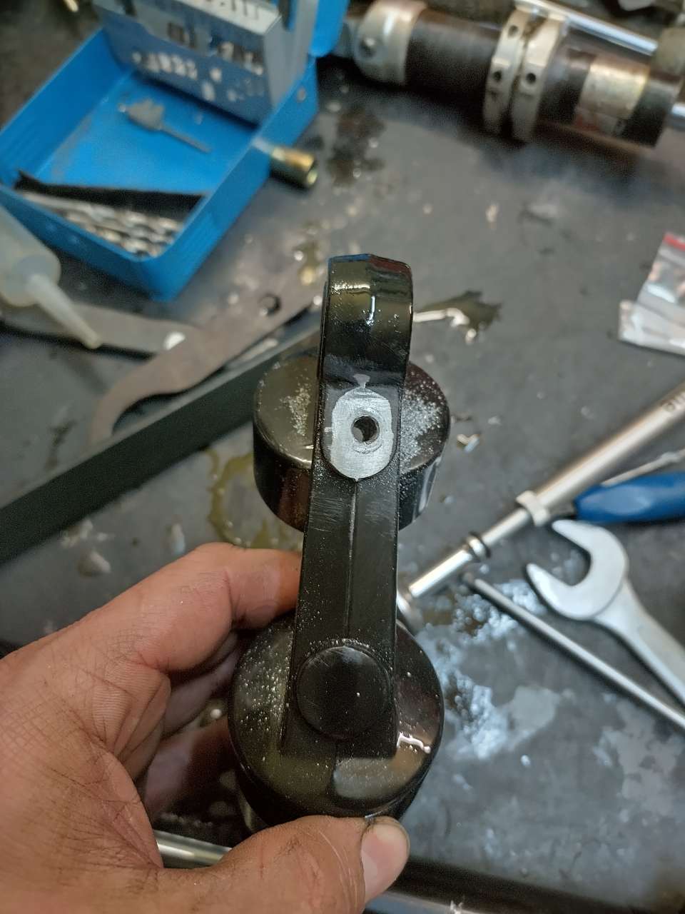 Den zweiten Dämpfer hab ich auch schon zerlegt und die Bohrung angebracht. Die meiste Arbeit macht allerdings das Reinigen...
