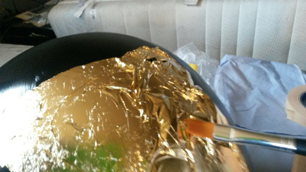Da Blattgold mein Budget übersteigt, gibts Schlagmetall. Schlagmetall hat eine Dicke von ca. 8 - 12.000stel mm. Ein Millimeter Stärke entsprechen demnach 8.000-12.000 aufeinander gelegten Blättern.