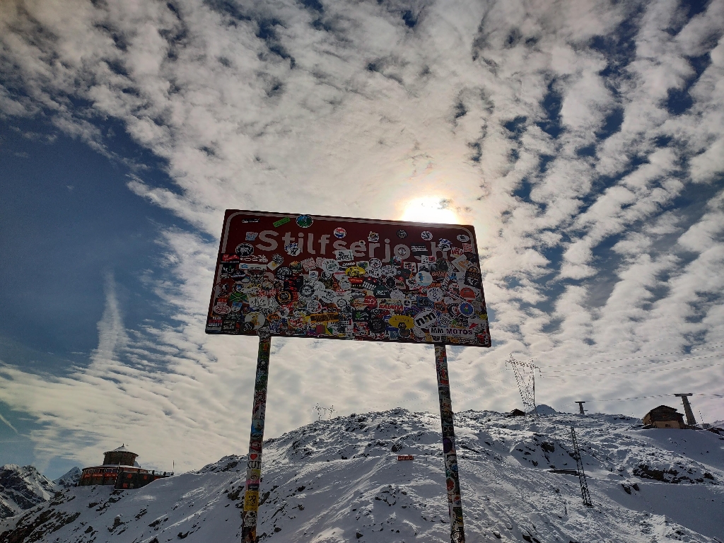 Das Stilfserjoch empfing mich mit einer fast surrealen Ruhe: Kaum 2–3 Autos und ein Linienbus waren unterwegs. Auch die üblichen Scharen von Radfahrern waren stark reduziert – gerade mal 10 wagemutige Sportler. Die leere trockene Straße, das Wetter und die traumhafte spätherbstliche Landschaft ließen den Körper massenweise Glückshormone ausschütten. Auf der Passhöhe bot sich ein ungewohntes Bild. Der Bratwurstverkäufer war sichtlich unterbeschäftigt, und warme Getränke waren Mangelware.