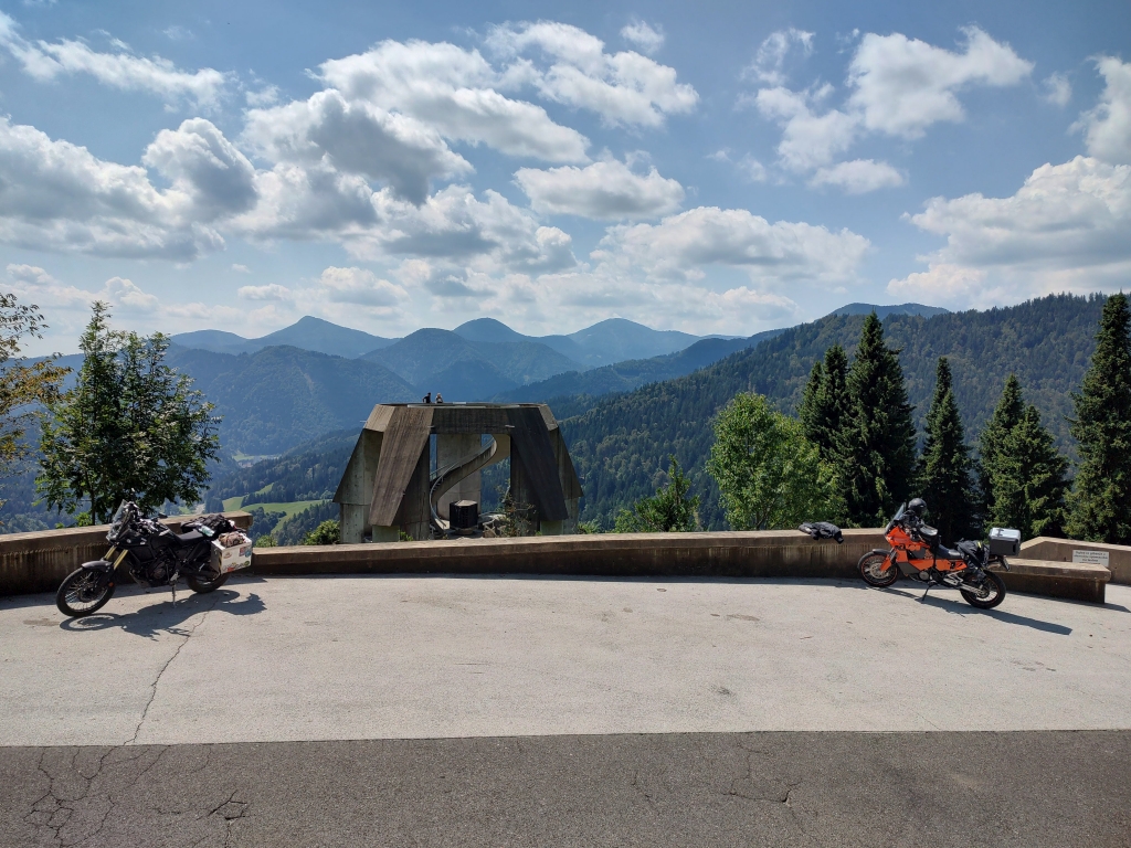 Nach einem kurzen Stopp auf der Passhöhe gings zum ersten Höhepunkt, der Mangart Straße. Der Overtourism bescherte mir 30min Wartezeit an der Kasse, da der Parkplatz am Pass voll war. Wir Motorräder durften dann wenigstens nach dem zahlen von 10€ vor den Autos wegstarten um die Strecke besser genießen zu können. Angeblich gehen die Kassierer um 18h heim und man kann dann mit dem KFZ gratis rauffahren. Der obere Teil vorm Schutzhaus war wegen eines Felssturzes gesperrt, die Behelfsparkplätze hoffnungslos überfüllt. Bin um dem Trubel zu entfliehen auf den Mali Vrh gestiegen und hab von oben dem Kommen und Gehen zugesehen und auch etwas von der imposanten Landschaft aufsaugen können.