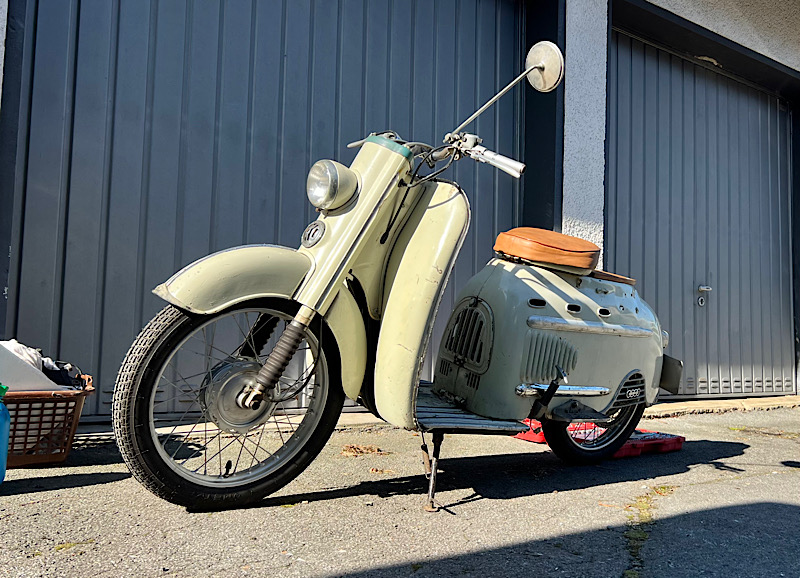 Darin steht eine DKW Hobby und einige Ersatzteile, Motorkram, 2. Karosse, Rahmen, Zeuch. Das Moped ist Bj '56 (glaube ich) und war seit 2021 nicht mehr beim TÜV, dafür aber die ganze Zeit angemeldet. Ich habe mich heute ein paar Stündchen damit beschäftigt und mit gutem zureden und einem Schluck Startpilot, das Gerät wiederbelebt. Ein bisschen weitere Zuwendung und dann ab zum TÜV. Motor ist gemacht worden und bestenfalls 100 Km gelaufen. Heftige 3,5 PS aus 74 ccm zerren an den Armen... :D