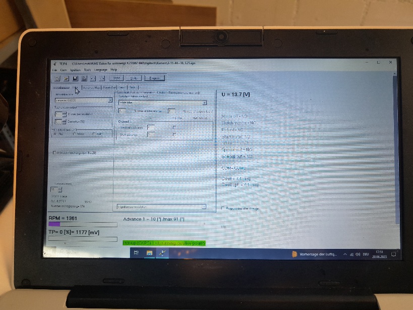Klemme ich den 2. Sensor ab (Frühzündung), startet die Maschine zwar, läuft aber, auch im Leerlauf, extrem unrund, so als ob nur alle paar Umdrehungen gezündet wird. Die Zündung erwartet also den 2. Sensor und kann ohne ihn garnicht arbeiten. Das unterscheidet sich grundlegend zur v105, bei der das Starten ohne den 2. Sensor problemlos funktioniert.