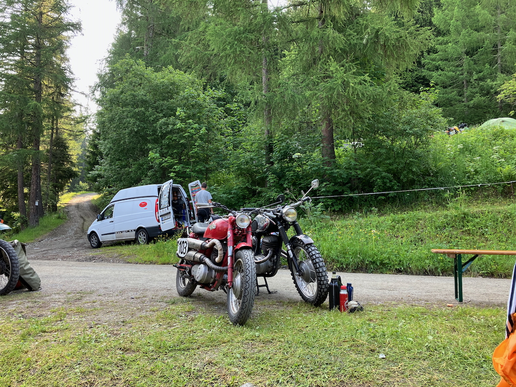 Es fängt schon damit an, dass Achim und ich das erste Mal mit einem Auto anreisen, mit Danny, dem Vito. Unsere Entschuldigung: die zwei betagten Italienerinnen, die wir gleich bei der Ankunft vor dem Gerngroß aus dem Bauch von Danny ziehen und in die (quasi ausschließliche!) Reihe der Motorräder aufstellen. Mit den kleinen, flotten, aber nicht langstreckentauglichen Mädels wird das allseits akzeptiert.