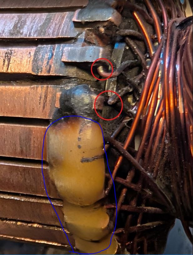 Mal vom Elektrolaien doof gefragt: In der blauen Markierung ist irgendwelches Isoliermaterial über die Verbindung Wicklung/Rotor geschmotzt worden.
