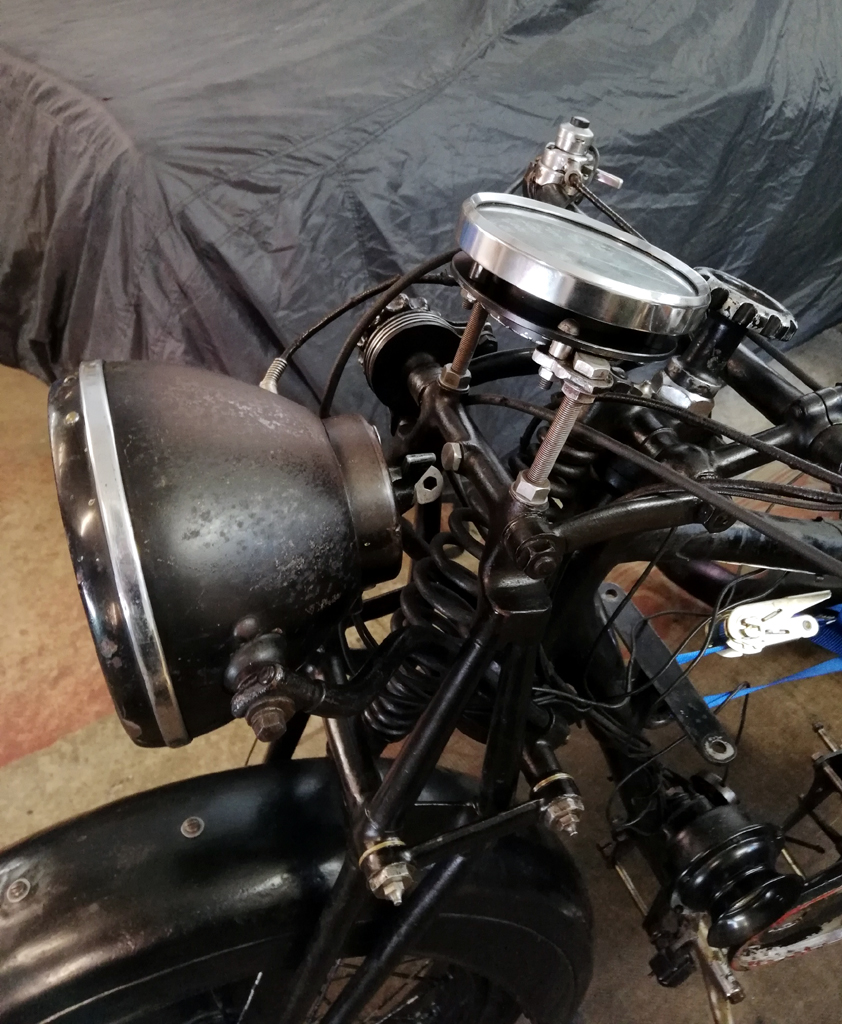 Neue Tachohalterung angefangen. Der Vorbesitzer hatte so Baumarktzeug gelb verzinkt verbaut, die M90 fährt auch zwar damit, aber naja. Ist ein ziemliches Gefrickel, da der Tacho riesig ist und immer irgendwie irgendwo anstoßen will, aber ich glaube, in die Richtung hier wird´s gehen.