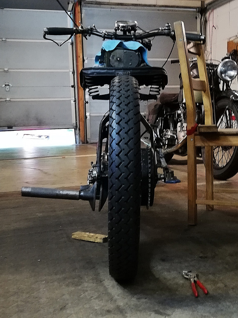 Dann den neuen Hinterradständer montiert, gibt´s zum Glück als Nachfertigung in England. "Mal eben", schon klar. Zehn Stunden später. Die Halterungen für den Ständer sind derbe verbogen, und im Nachkriegs-Köln hat außerdem irgendjemand aus zwei Hauptständern einen gemacht. Dabei wurde leider die Länge falsch kalkuliert, so dass das Geraffel ständig unter Spannung stand, ergo: Schutzblech eingerissen. :omg: