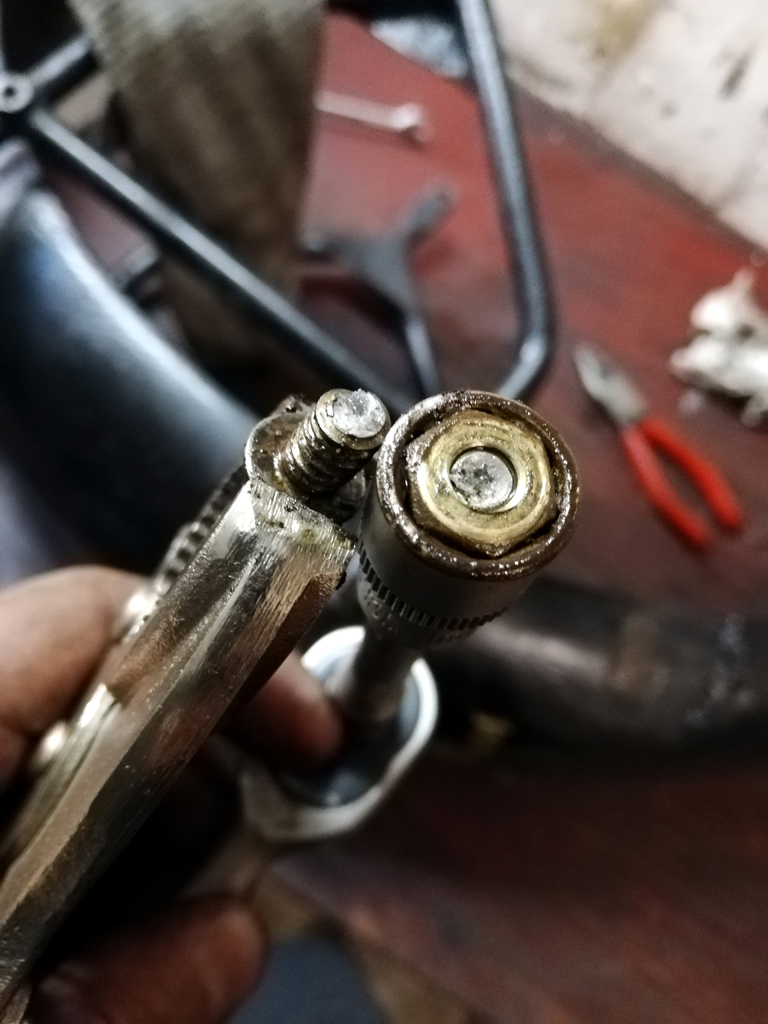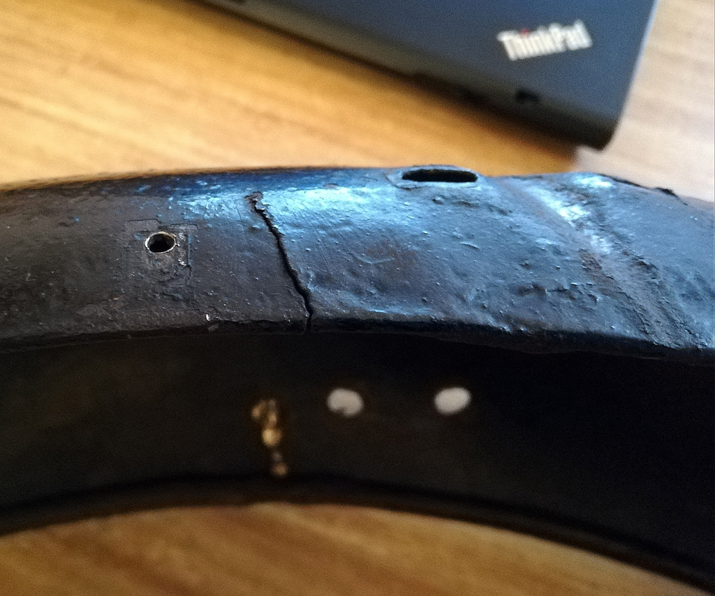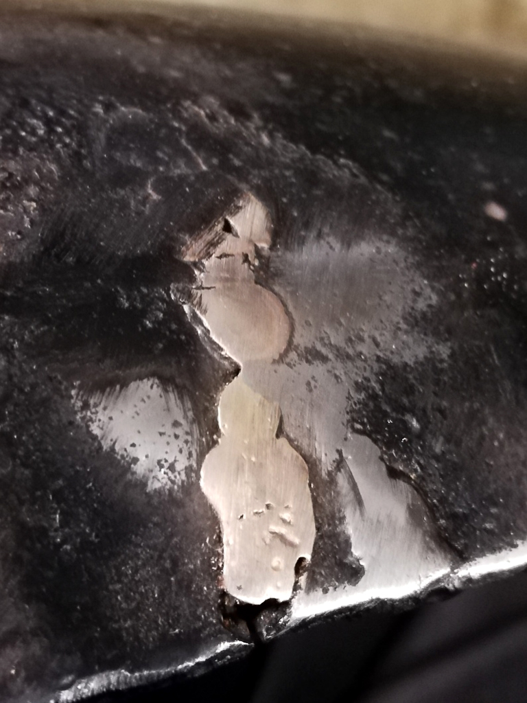 Hinten war ständig Spannung auf dem Schutzblech, ergo gibt es vier größere Risse und ein paar kleinere. Zwei Risse wurden scheints mit Messinglot derbe zugepappt und dann lackiert, der Rest blieb unangetastet.