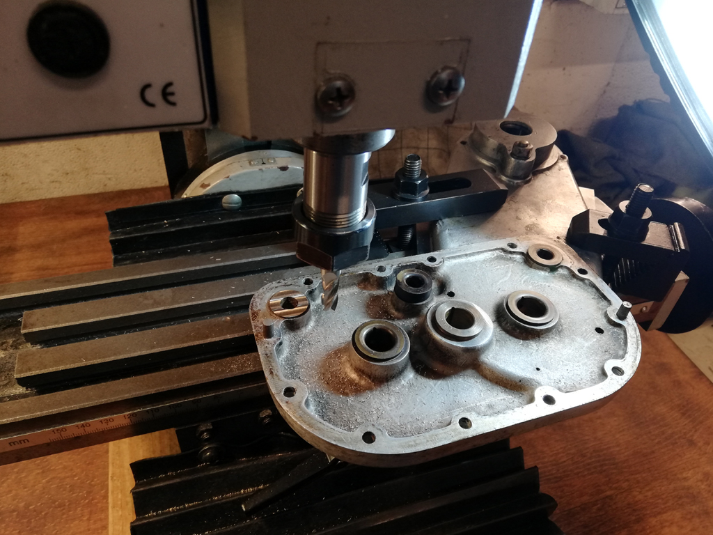 Ansonsten ein Gehäuseteil auf die Fräse gespannt und an einer Buchse, die den Auslass-Schlepphebel aufnimmt, ein klein wenig Material abgetragen. Mit einer 0,5 mm Anlaufscheibe unter der Achse vom Schlepphebel Auslass laufen nun die Nockenwellen und Schlepphebel mit ausreichend Luft und ohne zu hakeln.