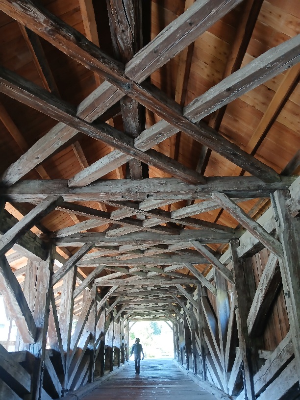 Unter Burg Heinfels bei Sillian besichtigen wir bei einem kurzen Halt die Bannbrücke. Die beeindruckende Holzkonstruktion wurde Ende des 18. Jahrhunderts gebaut und blieb bis 1945 als Straßenbrücke in Betrieb. Erst dann wurde die heutige, parallel verlegte Brücke von der französischen Besatzungsmacht errichtet, damit deren Panzer sicher den Fluß queren konnten.